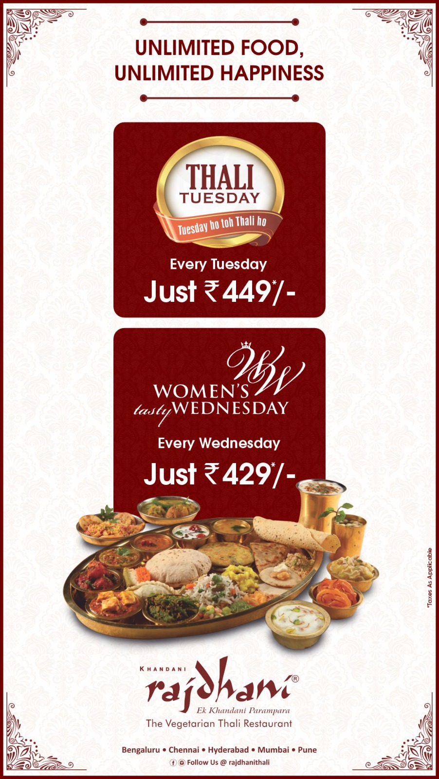 With our first outlet in 1985 in the bustling streets of Crawford Market in Mumbai, at Khandani Rajdhani, we don’t just serve food we serve a story. A story steeped in culture, tradition, and the timeless flavors of Rajasthan and Gujarat. For over four decades, Rajdhani has been the torchbearer of the Indian thali experience, offering an authentic taste of royal Indian hospitality across generations. Our journey began with a simple yet powerful idea to bring the soulful experience of a home-cooked meal to the restaurant table. Today, with over 15 million+ thalis served, we have become synonymous with Unlimited warmth, flavor and tradition. Every Rajdhani Thali is a symphony of over 30+ handcrafted dishes, lovingly made using heritage recipes. With a menu that changes every day, no two visits are ever the same and yet, the feeling of comfort, care, and nostalgia remains constant. From festive favorites to seasonal specials, from the heart of Rajasthan to the soul of Gujarat – Rajdhani is a celebration of India on a plate.
